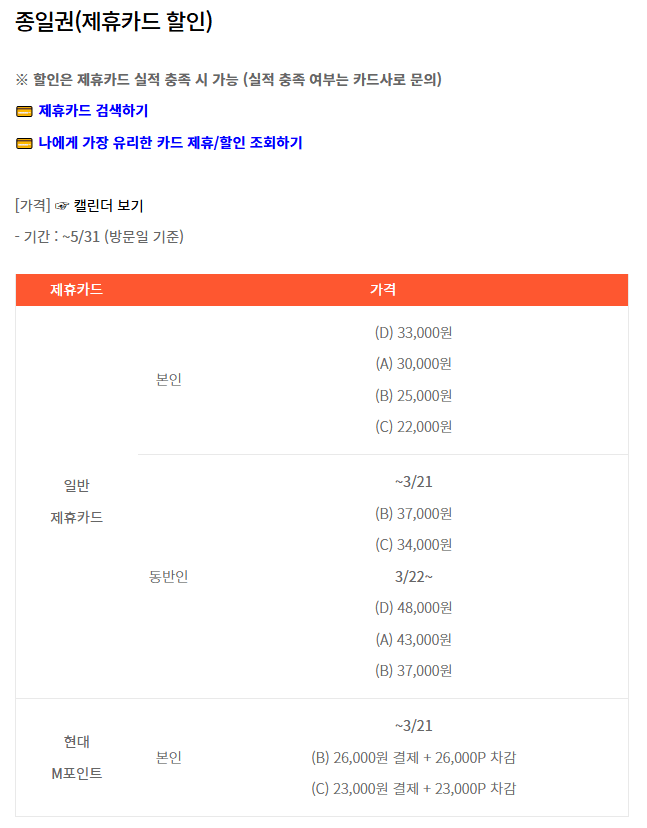 - 봄꽃축제 시즌 (3~4월): 신한카드 1+1, 대인 종일권 40%